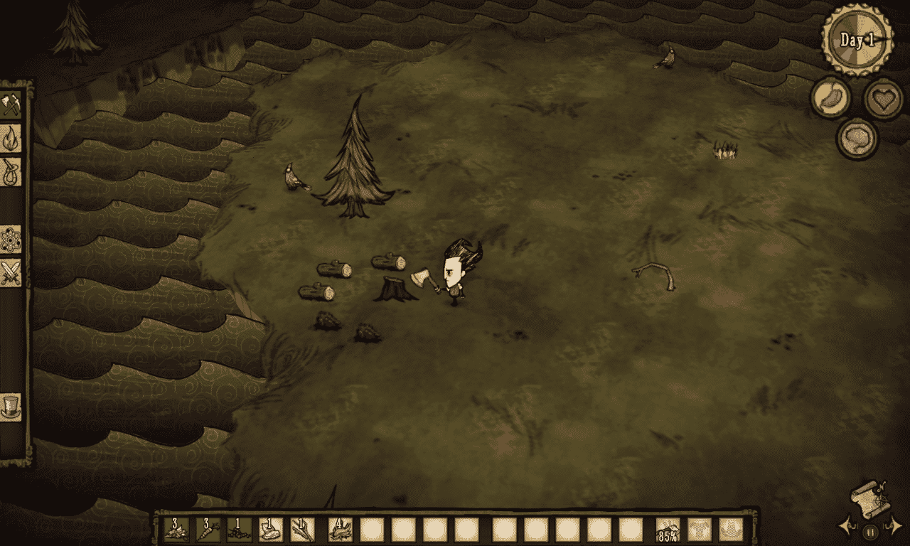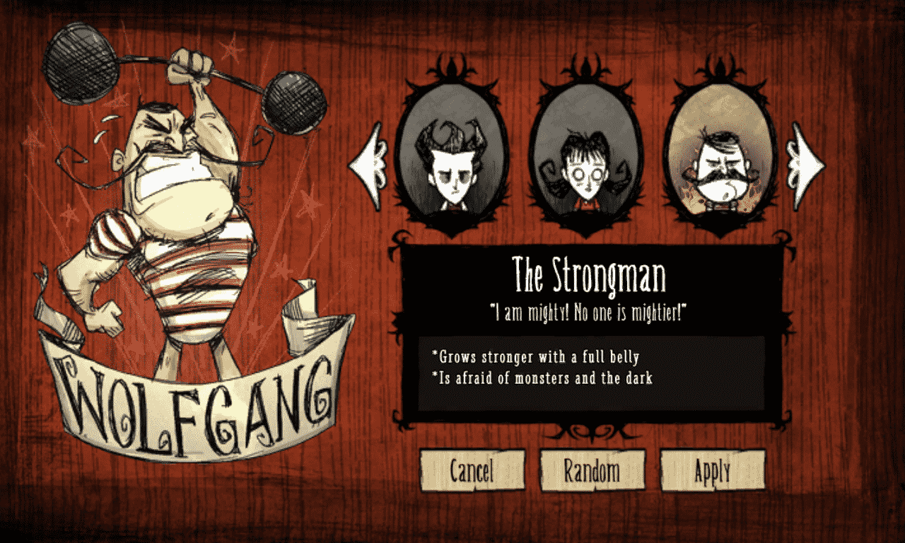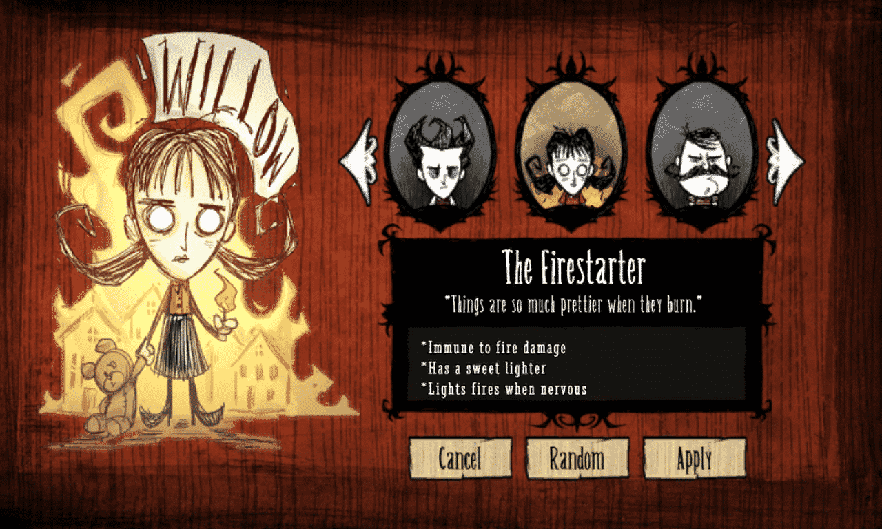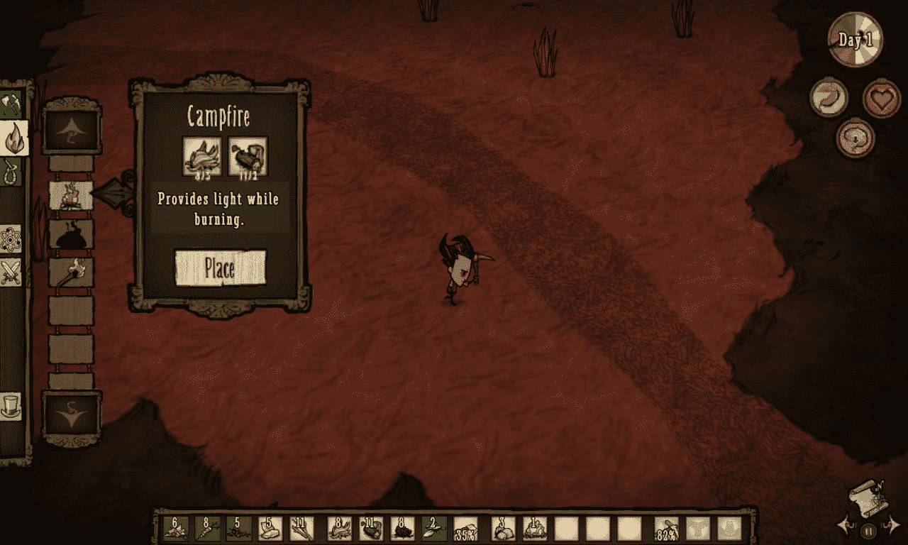 You’ll begin a new game as Wilson again, until you’ve earned a new face to play as. There are quite a few other characters that you can unlock and play in Don’t Starve, but you won’t find out how to unlock them here. I’m going to do my best to avoid any spoilers, because discovering all of the fun quirks of this game surely is one of its biggest charms. I will, however, show you two of the unlock-able characters: Willow and Wolfgang. One thing to keep in mind when choosing your character is your own personal play style, since each character sports their own flaws and strengths.