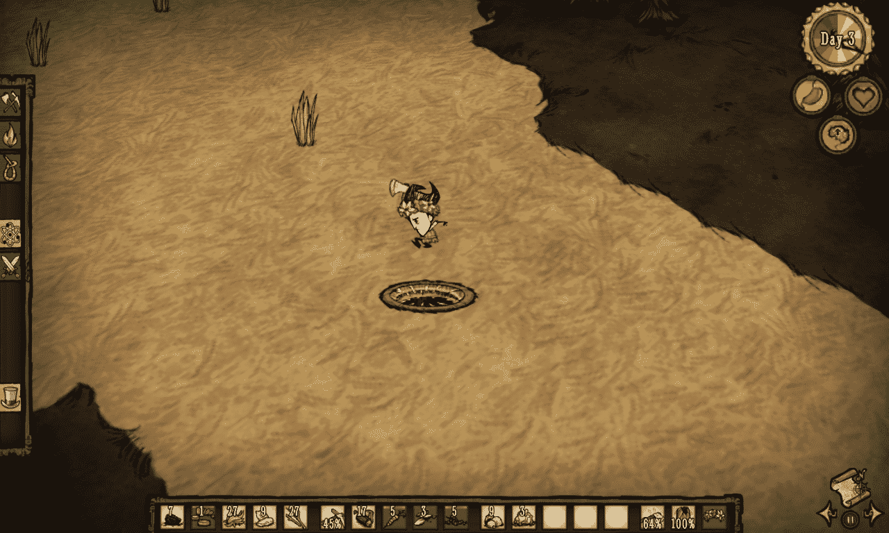 You begin the game as Wilson, a gentleman scientist who can grow a beard. You read that right, he grows a magnificent beard. As the game progresses, Wilson will sport some nice facial hair, and clever players may even be able to use that to their advantage! Don’t Starve has a habit of including some strange game mechanics but, if you use your noggin, you can overcome some of the toughest obstacles with ease. It is way more likely, however, that you’ll die quite a few times before you understand what exactly it is you should be doing. When you die, its game over, and you’ll have to start again.