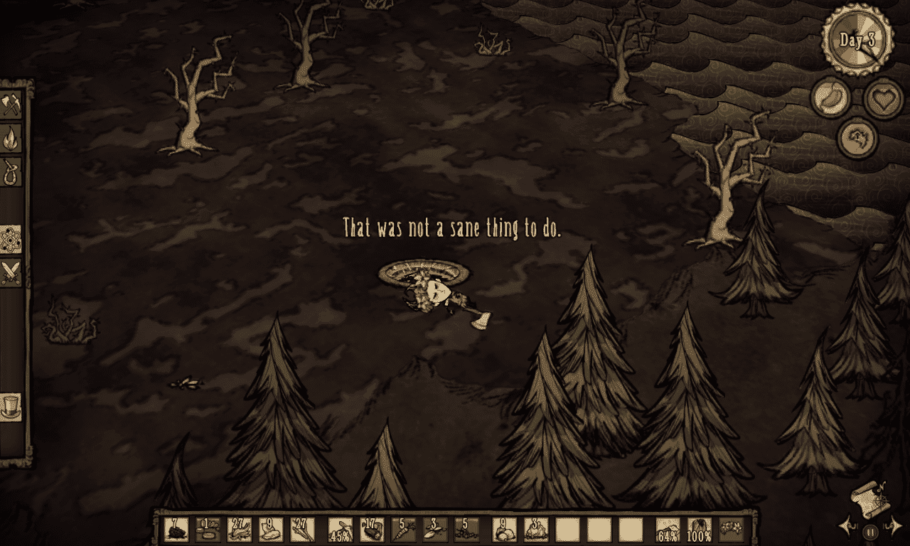 That man’s last words, along with the game’s title, are the only instructions you’ll have when you begin. The feeling of helplessness and confusion is exactly what the folks at Klei Entertainment wanted when they created Don’t Starve. You’re stranded in the wilderness, and your only option is to explore the area. If you want to survive then you’ll get creative and use some common sense to solve problems like needing food or light as the night approaches.