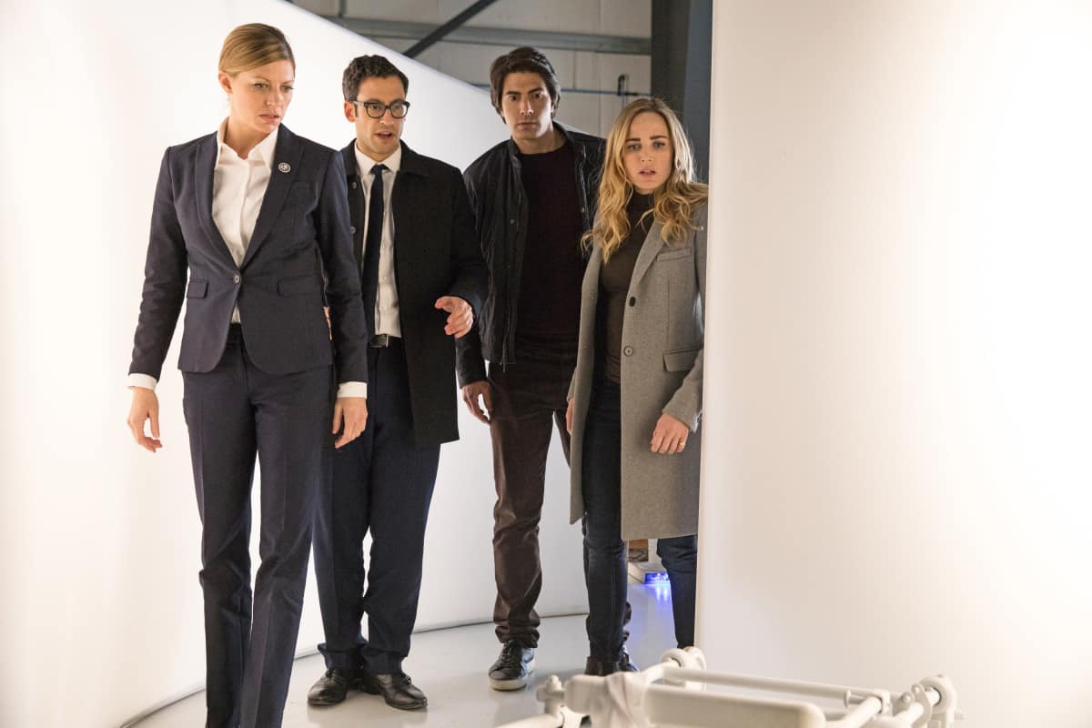 Pictured (L-R): Jes Macallan as Ava Sharpe, Adam Tsekhman as Agent Gary Green, Brandon Routh as Ray Palmer/Atom and Caity Lotz as Sara Lance/White Canary. Photo courtesy of DC Legends TV.