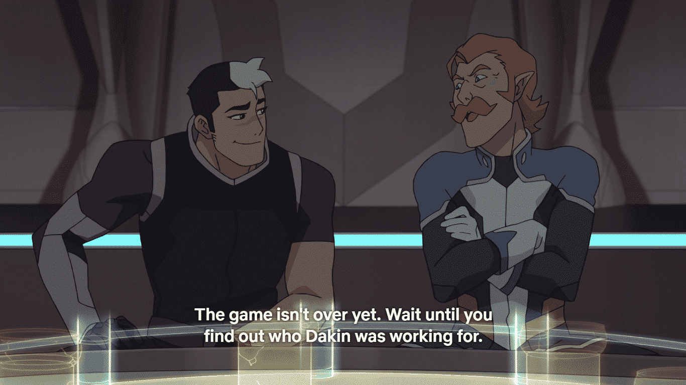 Finally, Coran delivers a line that is going to haunt me for weeks: “Wait until you find out who Dakin is working for.” Because we’ve seen that Dakin parallels Lotor’s character, this line is sinister. Thus far, Lotor has shown that he works tirelessly to pursue his own goals, but this line makes me believe that there may be greater forces at work. Is it possible that Lotor has been working for someone else in his pursuit to attain unlimited quintessence? Who could it be, and when will we find out?